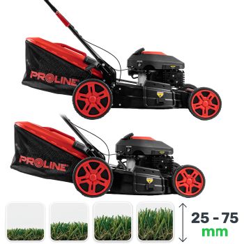 | Kod | typ silnika | pojemność silnika (cm³) | moc znamionowa (kW) | obroty silnika bez obciążenia (rpm) | szerokość koszenia (mm) | wysokość koszenia (mm) | pojemność kosza (l) | rozmiar kół przód/tył (m) | napęd noża |