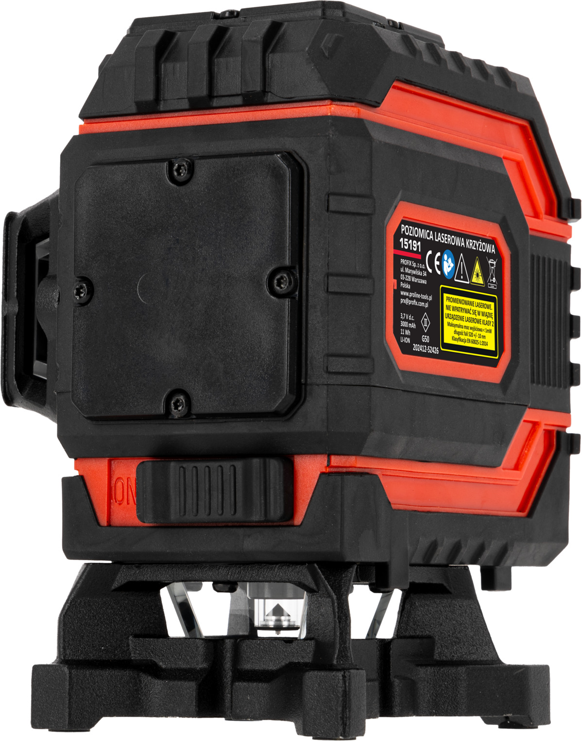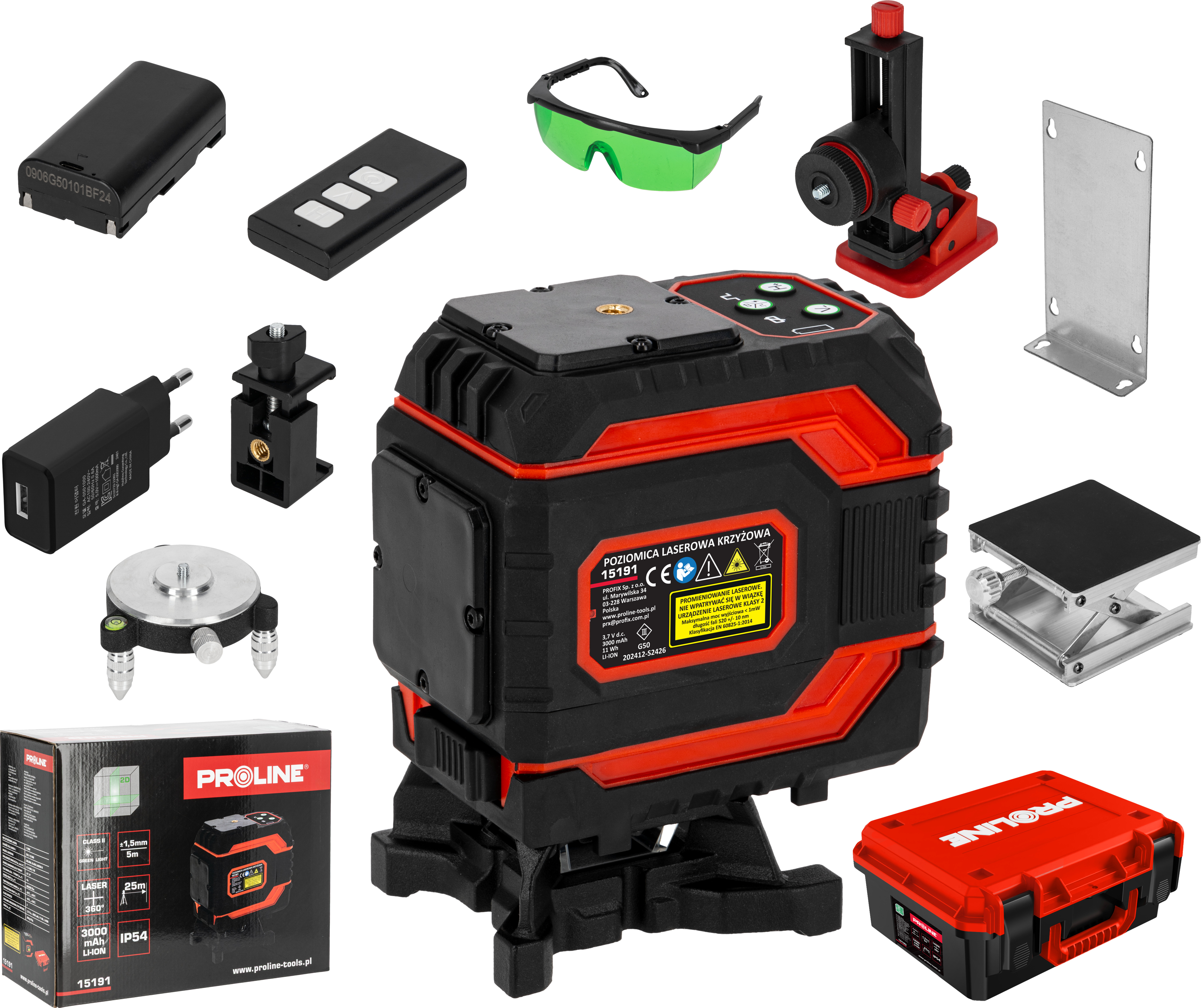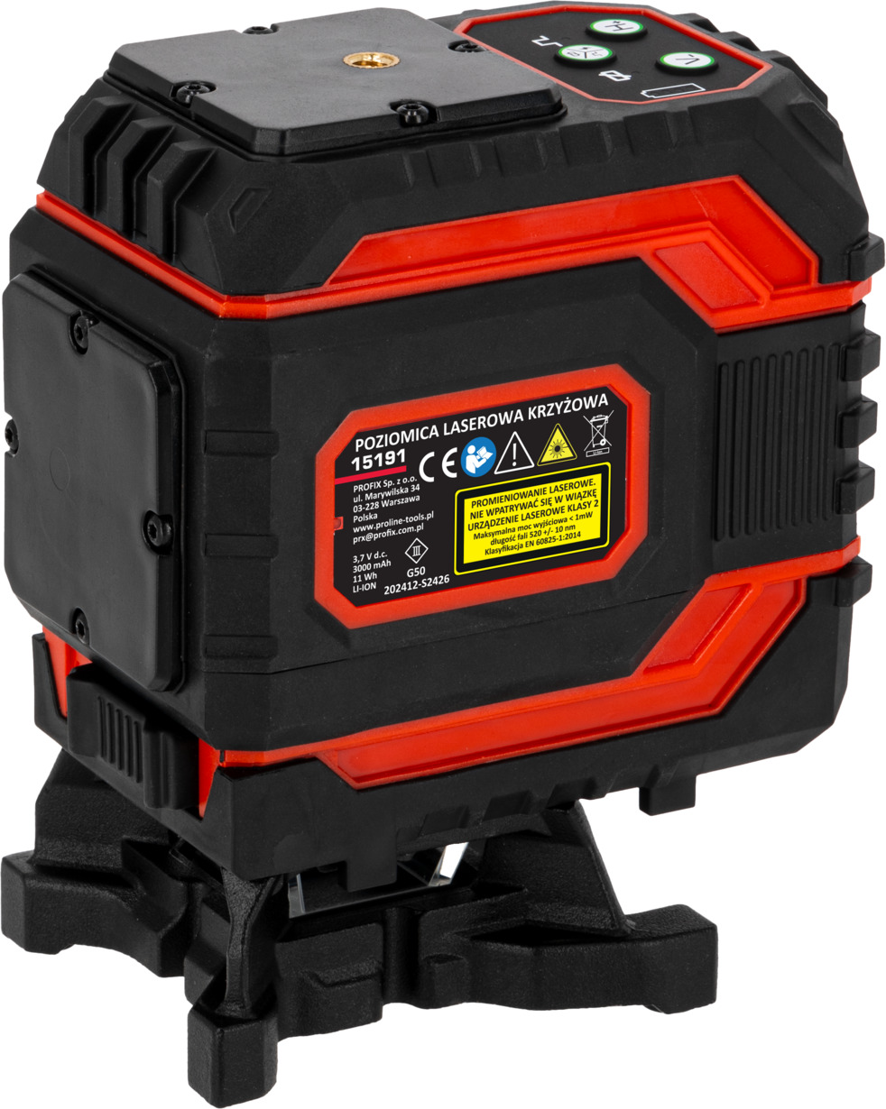 - W komplecie okulary zwiększające widoczność promienia lasera, ładowarka do akumulatorów, uchwyt z magnesem, podstawka obrotowa, pilot , podstawka umożliwiająca podnoszenie lasera w pionie, dodatkowo w modelu 4D uchwyt umożliwiający zawieszenie lasera od góry